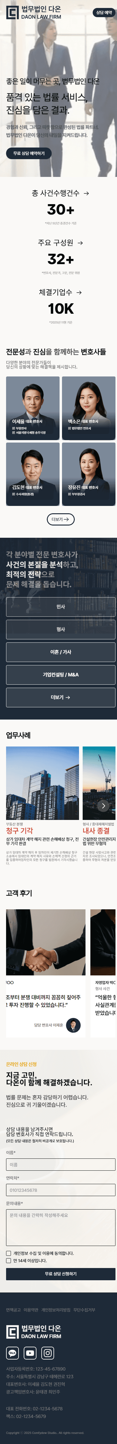 전문성이 돋보이는 정보 구조화(IA)와 직관적인 상담 버튼 배치를 통해 전환율을 극대화했습니다.